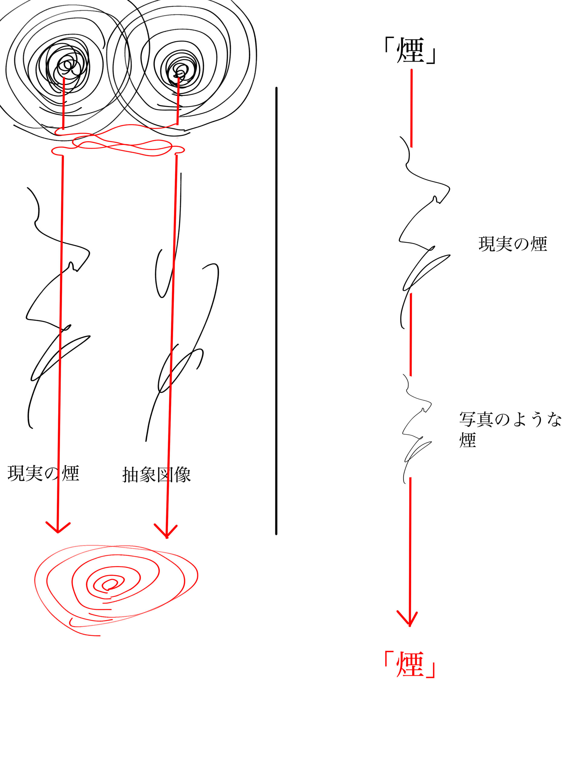 「煙」を描く、というのはどういう意味かというと、自分がよく考えることは、「煙」という存在を描くということだ。上の図で言うと、右側の図が頭の中に思い浮かぶ。まず、「煙」というものをまだ描けたことがないという状態から出発するとする。しかし自分は、お香を焚いたりする時に出るあの「煙」を知っている。そのような自分の知っている「煙」を頼りに、キャンバス上に煙の絵を描こうとすると、「煙の絵」が出来上がる。しかしそれでは「煙の絵」が描けただけで、「煙」が描けたことにはならない。