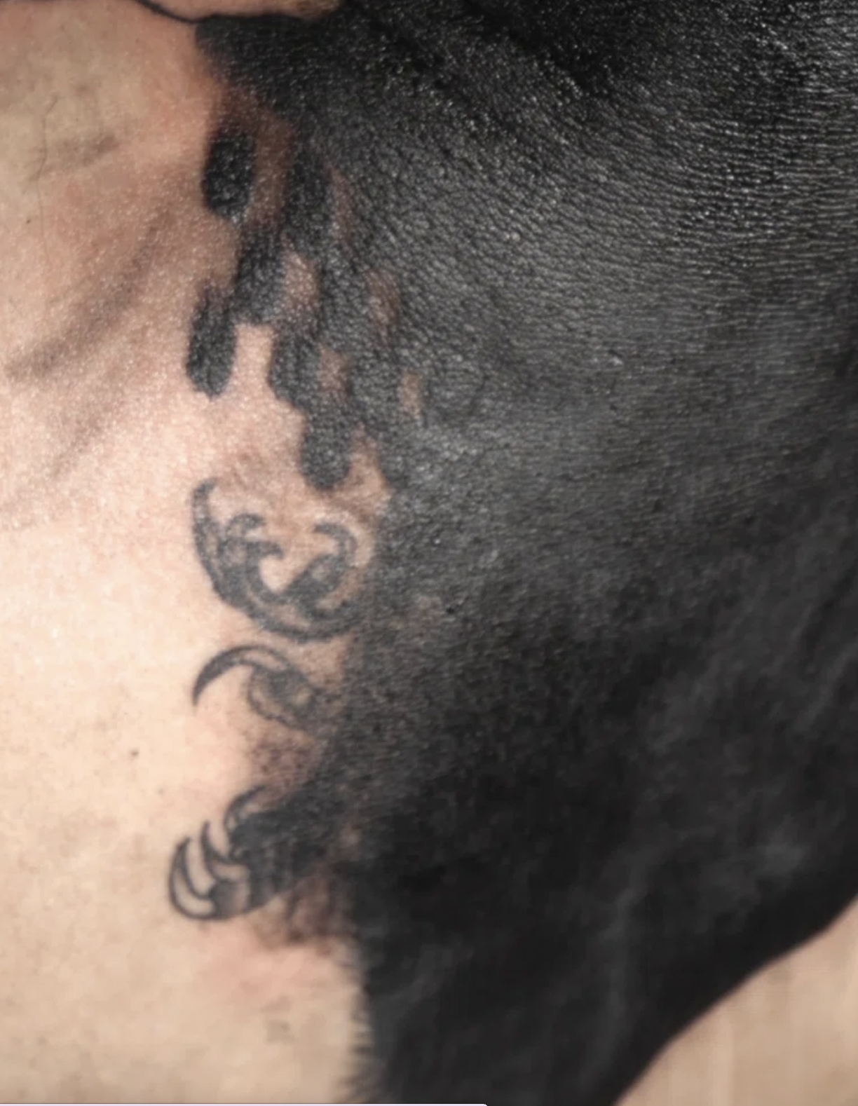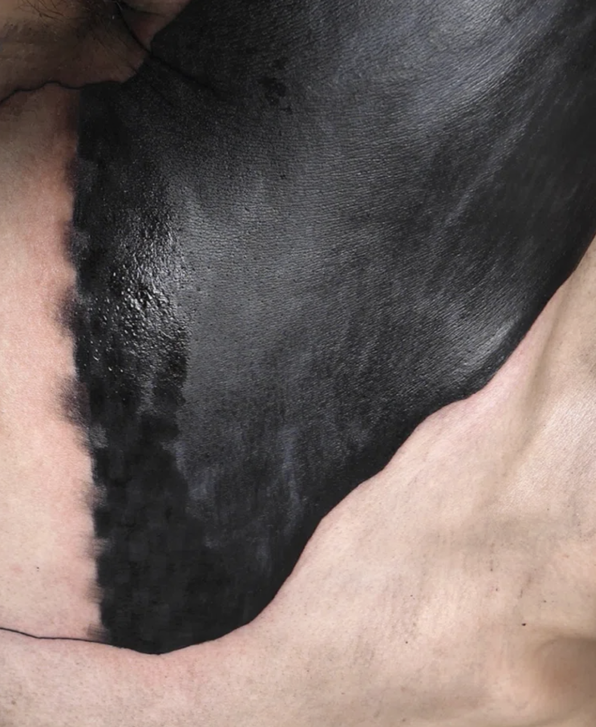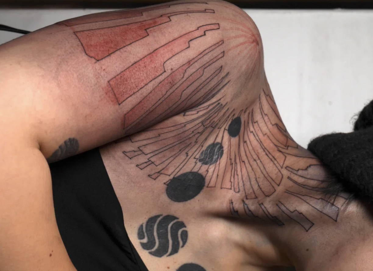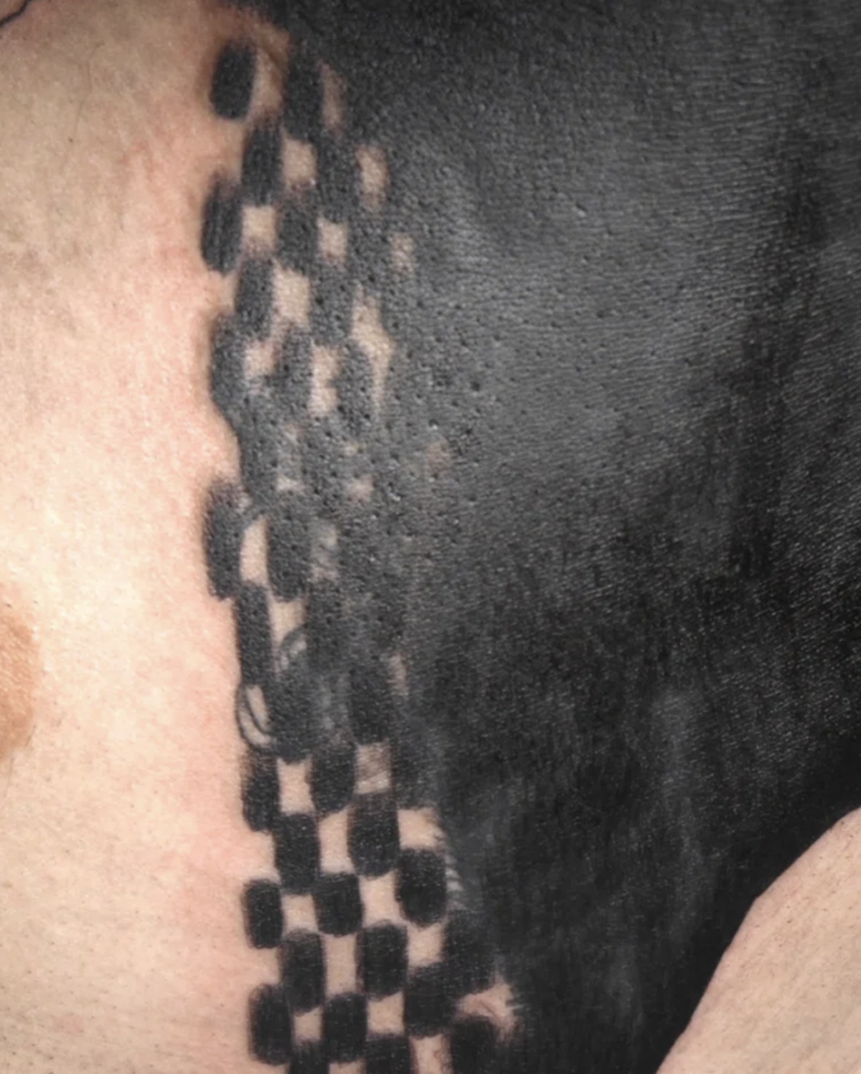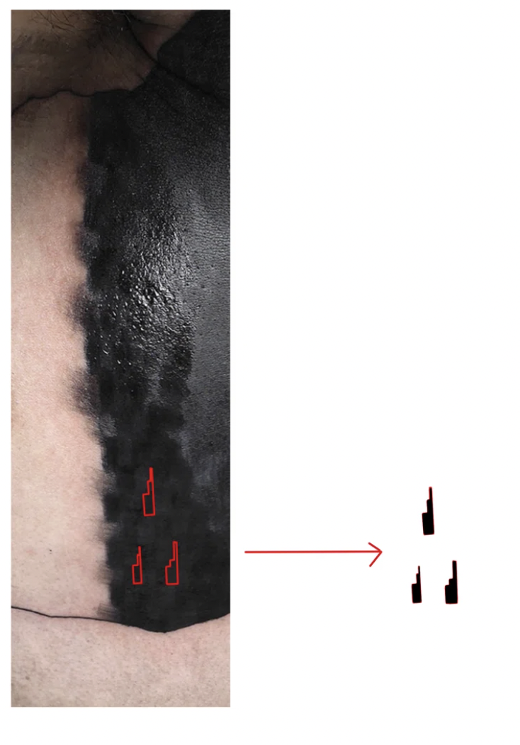 これはある時の施術時の皮膚を撮影したもので、ここでは先ほど書いたことのようにして、まだ見つけられていない図像を見つけるために、写真に写っているように「四角」というすでに見つけられている図像を規則的に敷き詰めるようにして彫っていくということをしていた。