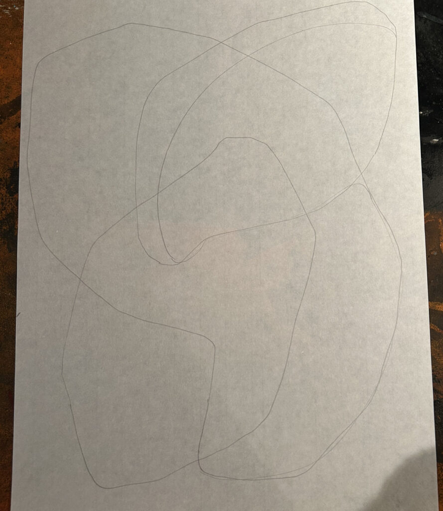 その連鎖を意識がイメージとして認識した後、インデックスAに対するはじめの関係線のイメージの、始点から余白を持たせて、余白を持たせた先の位置に鉛筆の先をあて、インデックスAに対するはじめの関係線のイメージを描画する。この時、インデックスAに対するはじめの関係線はイメージされきっていなくて、生成中のイメージであることが重要だ。描画が始まったら、インデックスAに対するはじめの関係線のイメージは消えて、描かれた線に対してや身体の動きに対して、など、複雑な関係の中で線のイメージが生成される。描画に1秒ほどかかる時は、見れる範囲で描かれた線のまとまりを捉えようとする。画面全体を捉えようとする。そこでの刺激もイメージの生成に関係してくる。