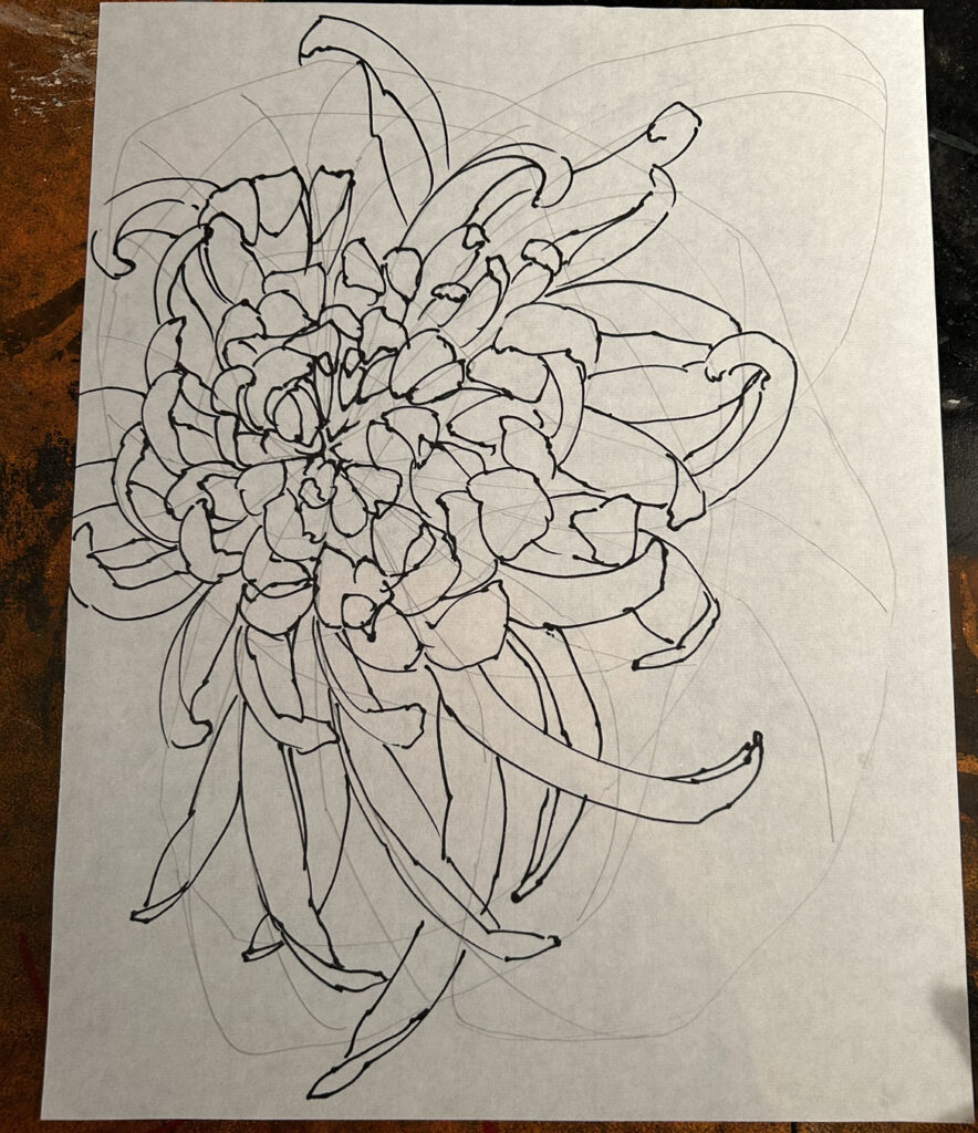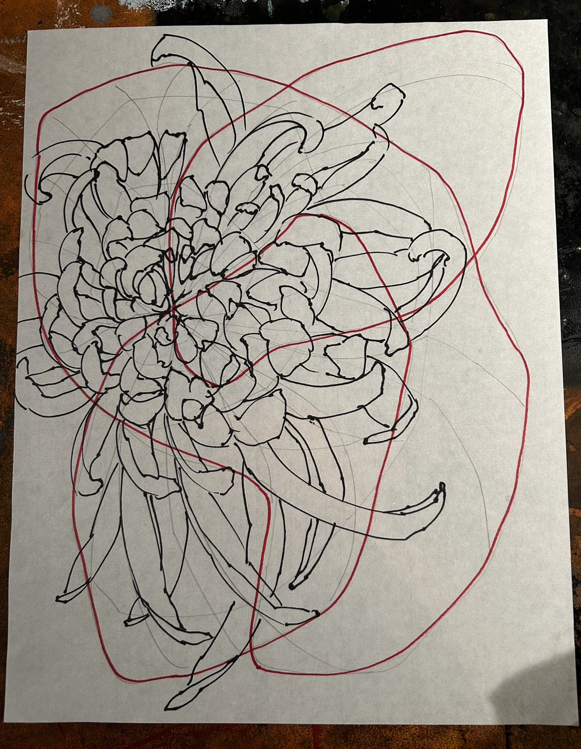 さて、ここから複雑な混合線の連鎖で菊を描くという今日の試みをはじめる。