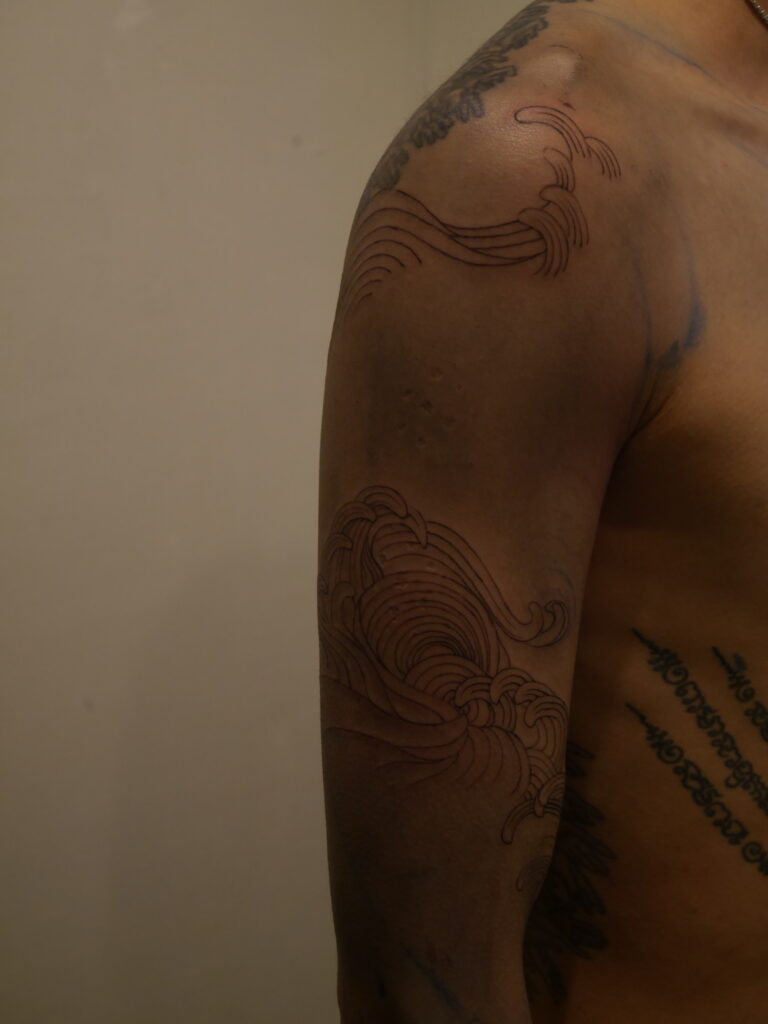 波の図像をまずは彫るということになってから、実際に彫っていこうと下書きをDさんの体にしている時、まずは任意の混合線を暗(そら)として描いた。つまり、この混合線への関係線として波の図像を現す。初めに描いた混合線は彫らないので、暗の混合線と呼んでいる。