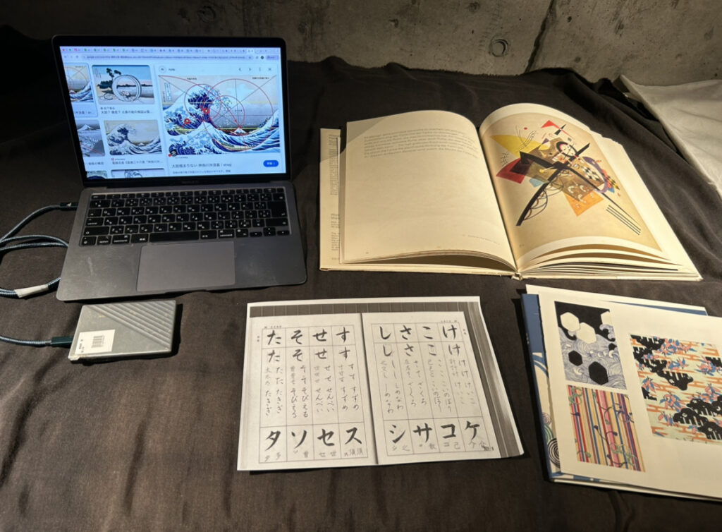 2026/01/20−1に写っているものは他に、カンディンスキーの絵と葛飾北斎の浮世絵の画像と、書のひらがなの練習見本。